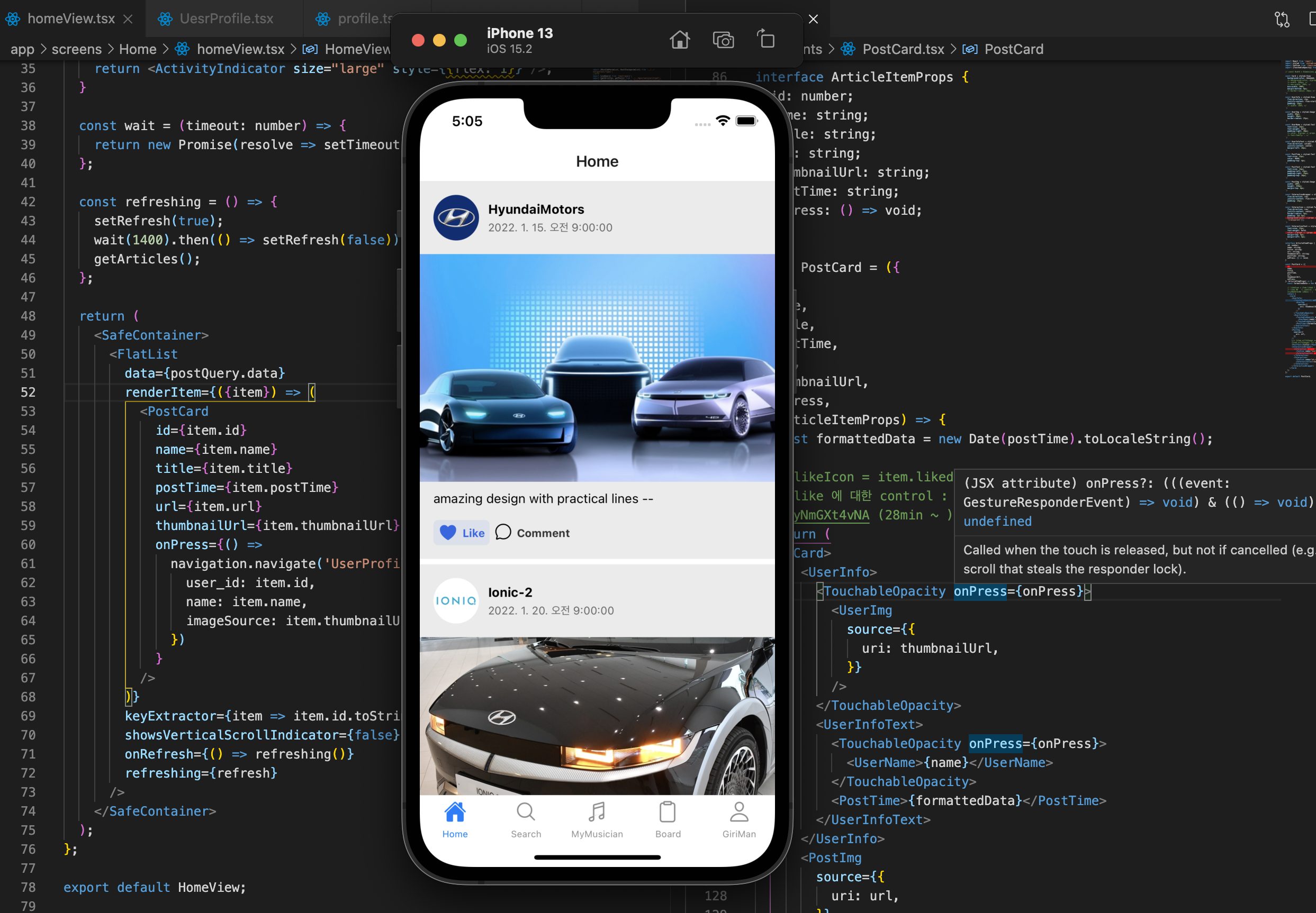 navigate의 첫 번째 인자로는 '이동할 화면', 두 번째 인자로는 '전달해야하는 파라미터'로 주어 다음 화면에서 이전 화면으로부터 값을 이어받으면서 이동하게 되는데, 오른쪽 화면을 담당하는 코드는 홈뷰의 FlatList에 들어갈 셀(PostCard라고 부르겠다)이다. PostCard 내부에서도 받을 인자의 타입을 선언해주고, 받은 값들을 그대로 필요한 UI 내부에 넣어주어 화면을 구성시킨다.